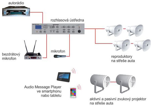 Střešní ozvučení mítinkových automobilů politických stran, pojízdných prodejen, reklamních aut atd. je koncipováno na základě jednoduché 12V rozhlasové centrály. Dovoluje přímo přehrávat reklamní sdělení či jiná hlášení a hudbu z vestavěného Mp3 přehrávače nebo připojeného mikrofonu.