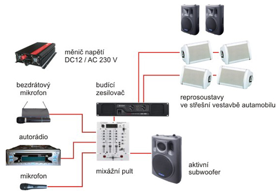 Prvním rozhodnutím, jež musí padnout je, zda ozvučení provedeme přímo na autobaterii, čemuž budeme muset uzpůsobit veškeré buzení, nebo zda ozvučení bude provedeno na 230 V, k čemuž bude zapotřebí tzv. měnič napětí, který 230 V vyrobí z 12 V autobaterie. V prvním případě vybíráme autozesilovače popř. aktivní reprosoustavy právě na 12 V a musíme podotknout, že tato varianta je opravdu mnohem složitější a vyžadující pečlivý výběr zesilovačů. Chyby jsou zde časté. V druhém případě, kterému jsou věnovány další řádky, je vše jednodušší a ozvučení se dá navrhnout variabilně. Bude to chtít ale již zmiňovaný měnič napětí (viz autodíly).