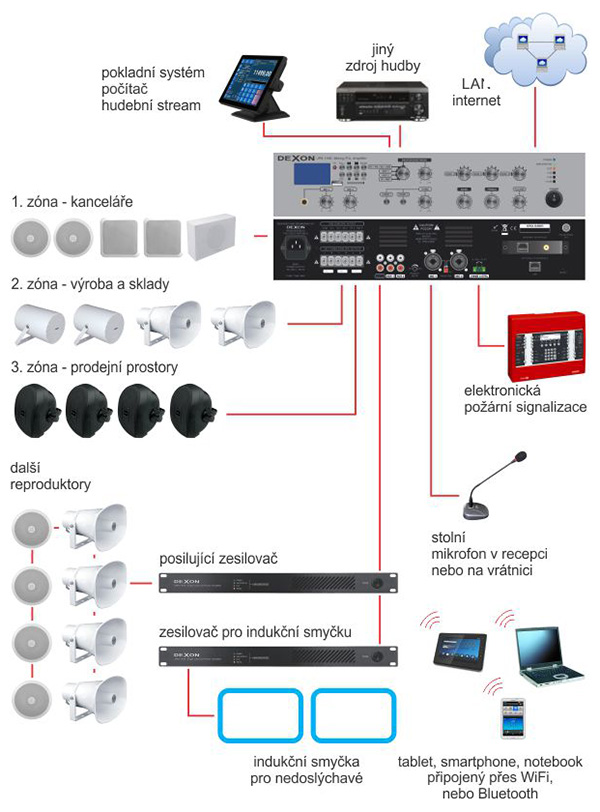 Čtyřzónové ozvučení výrobních prostor s použitím rozhlasové ústředny JPA 1504, která je výkonově posílena o zesilovač JPM 1504. Jako zdroj podkresové hudby slouží internetové rádio JBG 203. | |||