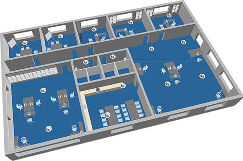 Ozvučení administrativních prostor je řešeno netradičně pomocí 12 sad Bluetooth ozvučení s podhledovými reproduktory, zesilovači JPM 2021 a nástěnným přehrávačem MRP 2171, nebo 4170. Je také doplněna rozhlasová ústředna JPA 1185 pro další prostory. | |||
