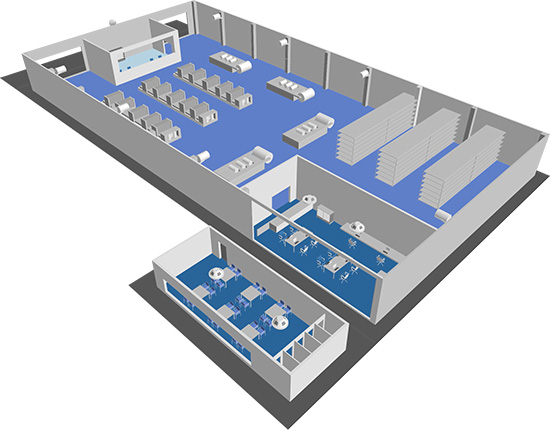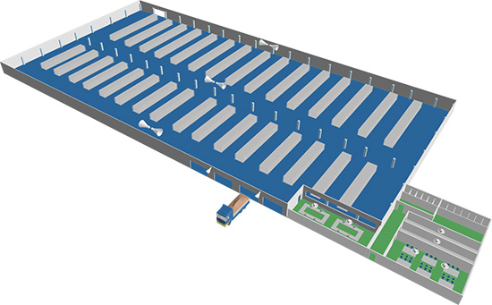 Výrobní hala českého výrobce kosmetiky je ozvučená digitálním systémem IP audio prostřednictvím mnoha digitální reprosoustav, zesilovačů a podhledových reproduktorů. Systém je dále doplněn přepážkovým mikrofonem PA 701 a regulátory hlasitosti. | |||