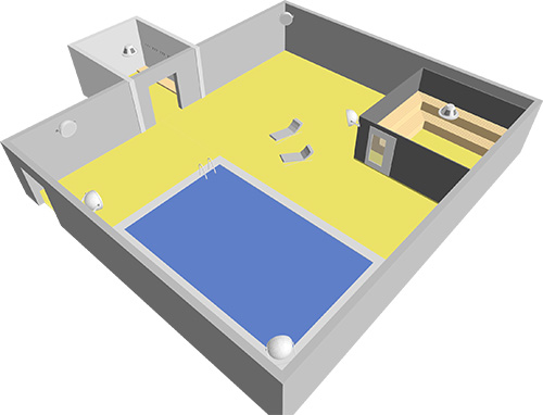 Dva ozvučovací celky pro 1. a 2. nadzemní podlaží - prostory bazénu, masérny, koupele a dalších prostor je tvořen rozhlasovou ústřednou, podhledovými reproduktory v zónovém členění s důrazem na vlhkuodolnost repro.
