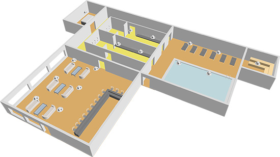Několik sad nástěnných přehrávačů a podhledových reproduktorů s napojením na další zdroje hudebního signálu ozvučují interiér fitness a wellness centra.