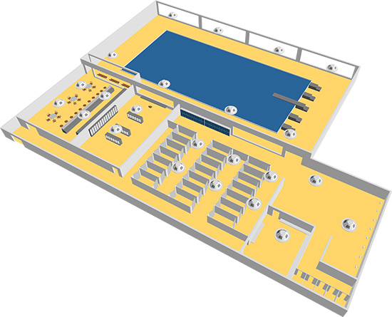 Větší množství závěsných reproduktorů řady RPT xxxZ ozvučuje prostory sportovního centra, wellness a fitness.