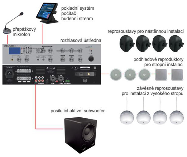 Výhodou prodejnového ozvučení je fakt, že nepotřebujeme řešit zóny. Hlavním zesilujícím prvkem bude tzv. rozhlasová ústředna. Jako základní modely (lišící se výkonem) Dexon nabízí řadu JPA 3035, JPA 1185, JPA 1306, JPA 1506. Patřičný model vybereme v podstatě podle typu a množství použitých reproduktorů. Ústředna nejenom zesiluje, ale má vestavěn i Mp3 přehrávač, FM rádio, Bluetooth a množství vstupů, takže použití různých zdrojů hudby se meze nekladou. Někdy prodejny přehrávají své Mp3 soubory, někdy FM rádio, někdy mají ústřednu napojenou na počítač pokladny, který poslouchá hudební stream z centrály (to je případ prodejen v řetězcích).