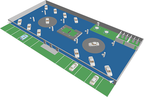 Prostory prodejny a autoservisu jsou vybaveny podhledovými reproduktory RPT 110x110 a nástěnnými reprosoustavami SP 512. Bohatě vybavena ústředna JPA 1306 je napojena také na mikrofon PA 570.