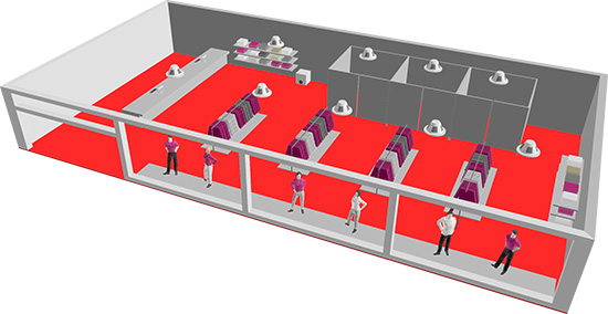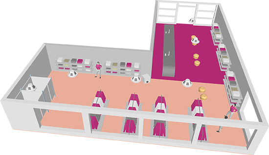 Vícekanálové řešení ozvučení prodejních i reprezentačních prostor, kdy v každé zóně hraje jiná hudba. Jako reprosoustavy byly zvoleny nástěnné SP 512.