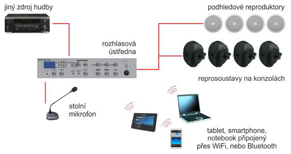 Kombinace zesilovače pro indukční smyčky, rozhlasové ústředny a podhledových reproduktorů vč. mikrofonů pro účely vnitřního ozvučení i pro veřejnost. | |||