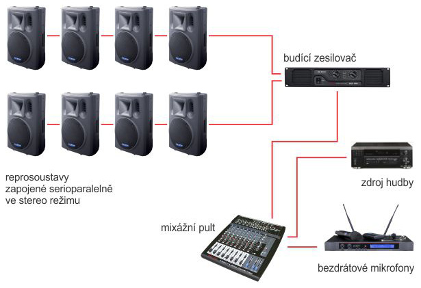 V praxi se volí buďto metoda klasického plošného ozvučení pomocí 100 V rozvodu, což ale činí jisté nároky na zesilovače a kabeláž, nebo je možné zvolit metodu jednodušší a to pomocí několika (v našem případě 8 ks) satelitních reprosoustav BC 800 nebo BC 1000 nebo BC 1200 a budícího zesilovače DAH 800 a DAH 1700. Reprosoustavy se poté napojí sérioparalelně, podle potřeb na místě a především podle jejich počtů.