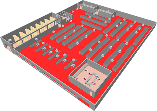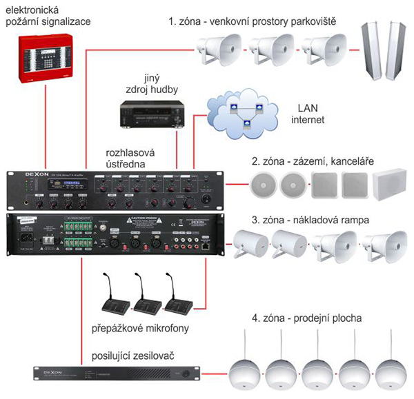 Větší množství podhledových reproduktorů je buzeno maticovou rozhlasovou ústřednou JPA 6240, jež je doplněna o posilující zesilovače a streamery internetových rádií. | |||