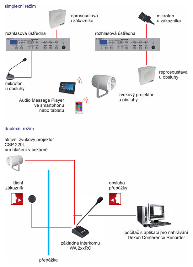 Simplexní režim od obsluhy k zákazníkovi provádíme jednoduchou a odzkoušenou kombinací stolní mikrofon PA 580 (obsahuje vypínač a mikrofon na variabilním stojánku) – malá rozhlasová ústředna JPA 3035 a reprosoustava umístěná na přepážce. Obvykle SP 442 s konzolou, ARS 190, která je miniaturní, nebo ARS 295, což je plastová skříňka. Tento systém nastavíme dostatečně srozumitelně a hlasitě, samotná přepážka (oddělení) nám napomáhá potlačovat vznik zpětné vazby.