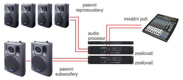 Výkonová ozvučovací sestava s aktivními výkonovými reprosoustavami, mikrofony i mixážním pultem. Doplněna je kompletní kabeláž. | |||