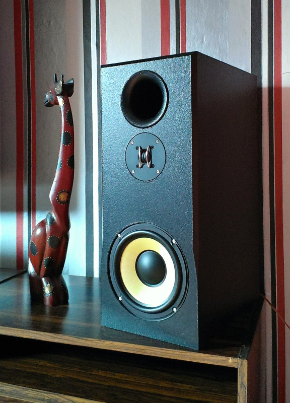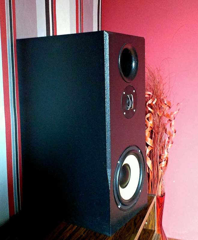 Základ vycházel z Vaší konstrukce, kde je použit basový reproduktor IRB 20 a výška IRT 10/80/01,8. Vyhýbku jsem použil odladěnou, která je zde u projektu ve Vašich konstrukcích. Byla mnou pouze spájena. Konstrukce se však trochu liší od té Vaši. Na korpus byla použita 18mm MDF deska a přední stěna má tloušťku 22mm. Reproduktory jsou zafrézované, stejně jako nátrubek a svorkovnice na zadní straně. Bylo provedeno také skosení hran na přední stěně. Ozvučnice má odlišné rozměry, je totiž tažena více do vejšky. Basreflexový nátrubek se přesunul ze zadní strany na přední a to až nad výškovou kalotu. Nátrubek ma oboustrané zaoblení a je dle programu WinISD odladěn na 44Hz. Jeho Ø je 6.5cm a dlouhý je 16cm. Ozvučnice má přibližně 33l. Jako povrchová úprava byl netradičně použit Warnex lak. Někumo se může zdát do obýváku nehodící se, mě to však nijak neruší.