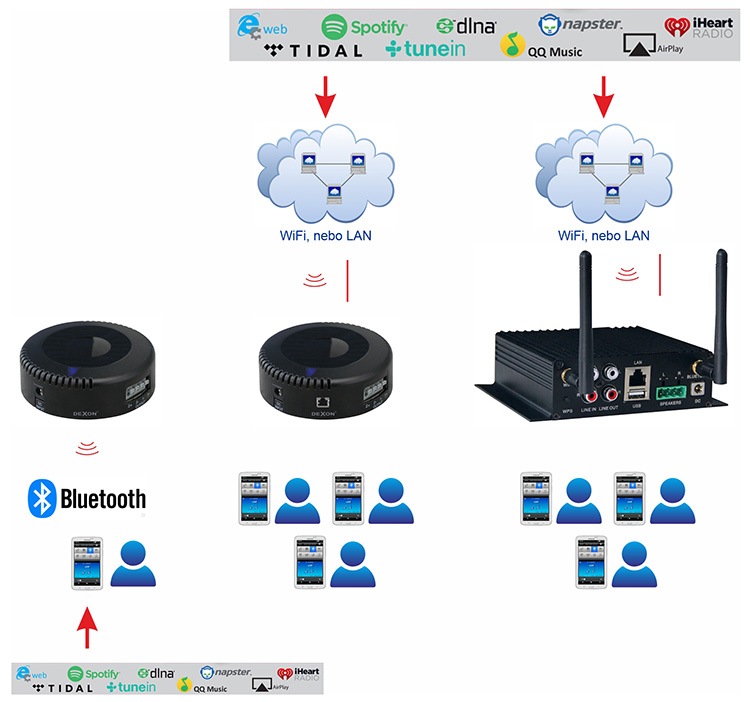 Další možností, jak získat zdroj hudby pro saunu, je buzení rychlé kompaktní, bezdrátové, pomocí Bluetooth nebo WiFi na reproduktoru. Tentokrát na zdi nic nebude, není vidět žádná krabička se svíticím displejem. Vše je skryto. Jako budící zesilovač, tedy zdroj hudby, který je namontován vně sauny, kde je bezpečná teplota, zvolíme zesilovač JPM xxxx s Bluetooth, nebo WiFi, nebo LAN připojením. Hudbu streamujeme z aplikace ve smartphonu, tabletu, televizi, notebooku nebo stolním počítači. Čerpáte ji z internetu nebo ze svého domácího či cloudového úložiště.