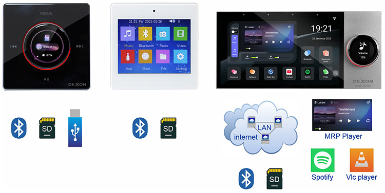 Mohli bychom vám doporučit připojení na stávající centrální audio systém v obývacím pokoji, ovšem je to nepraktické. Uživatelé chtějí mít ozvučení sauny obvykle oddělené. Existuje přelomová, do jisté míry, elegantní možnost ozvučení. Představte si, že vedle vypínačů na osvětlení instalujete další chytrou krabičku. Tou je tzv. nástěnný přehrávač se zesilovačem. Je to vlastně takové rádio pro saunu. Má v sobě přehrávač audia a videa, zesilovače, FM rádio nebo internetové rádio, většinou dotykový displej a hlavně spojení Bluetooth a na internet přes LAN kabel, nebo WiFi. Napájí se rovnou z 230 V a není potřeba žádný překážející adaptér. Předností nástěnných přehrávačů Dexon je jejich komfort a to, že v domácnosti nikde nic nepřekáží a hudba je vždy snadno dostupná, navíc i přes aplikaci v tabletu nebo smartphonu. Vše záleží na komfortu přehrávače, který si vyberete.