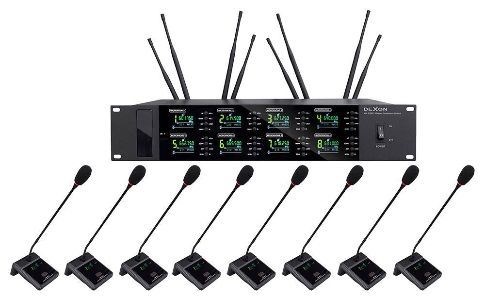 Stručný popis: UHF, true-diverzitní, obsahuje přijímací stanici + 8 bezdrátových stolních mikrofonů, digitální ladění, zpětný IR přenos do mikrofonů pro rychlé naladění a spárování, funkce priority pro první mikrofon, uzamčení, podsvětlené displeje, separátní i sloučené výstupy, dosah 130 m, velice rychlé zprovoznění, variabilita, výborná srozumitelnost, doba provozu 6–8 h. Rychlé ozvučení zasedání s prioritou!
