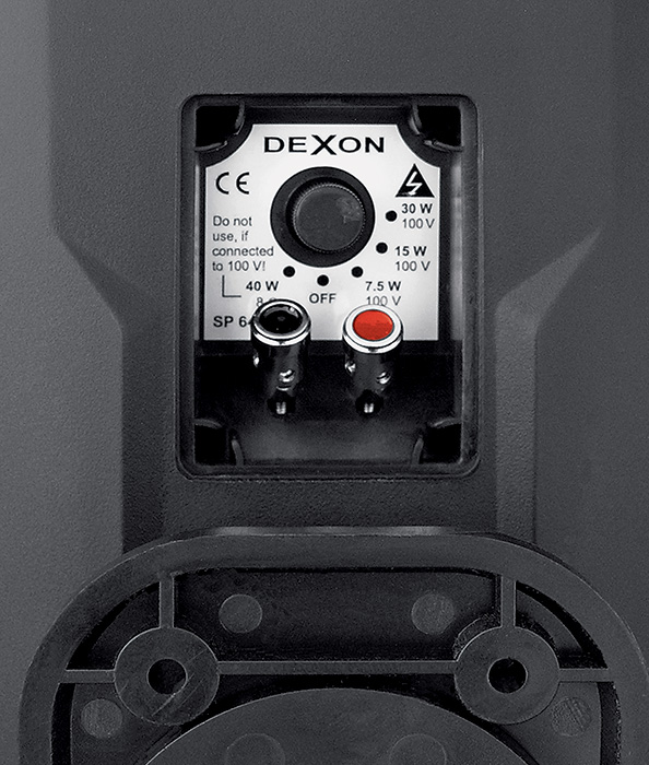 Připojení reprosoustav je možné ve vysokoimpedančním režimu (100 V), nebo v nízkoimpedančním režimu (8 Ω). Na to je určen přepínač výkonu (a tedy i hlasitosti) nad připojovacím terminálem. Dobrou vychytávkou je, že reprosoustavy dokážeme i zcela vypnout. Připojovací terminál a přepínač je proti vodě chráněn gumovou krytkou.