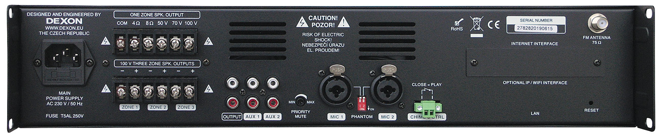 Stručný popis: 2 line + 3 mic vstupy, 3 zóny, 180 W, priorita, přehrávač MP3, SD + USB čtečka, FM tuner, Bluetooth, audio modul pro gongy a hlášení, IR dálkové ovládání, příprava pro IP i WiFi, vysoká účinnost, kvalitní zvuk