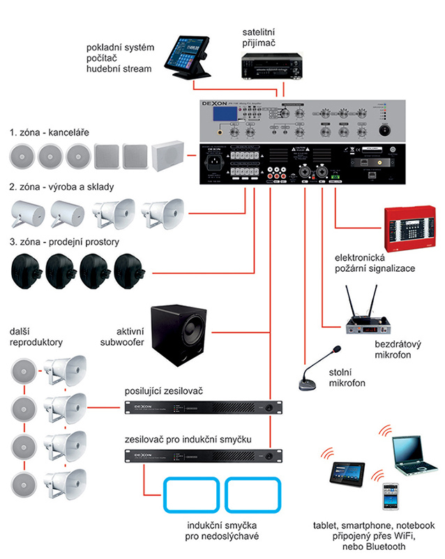 - kompatibilita s dalšími přístroji dexon pro řešení podkresové hudby a s přepážkovými mikrofony přímo určenými pro plošné ozvučení, žádné amatérské řešení