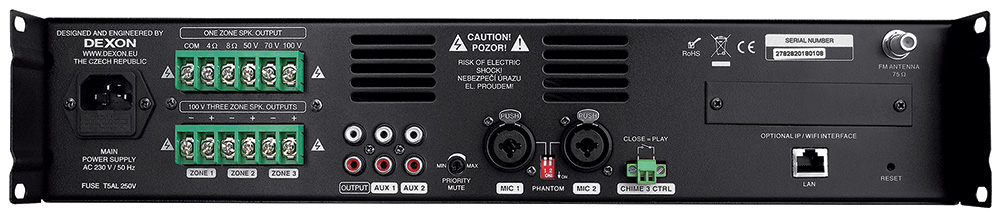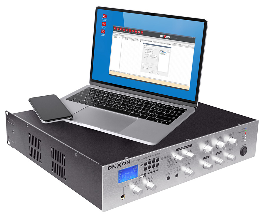 Stručný popis: 2 line + 3 mic vstupy, 3 zóny, 180 W, priorita, přehrávač MP3, SD + USB čtečka, FM tuner, Bluetooth, audio modul pro gongy a hlášení, IR dálkové ovládání, digitální IP technologie audio ozvučení, LAN vstup, vysoký komfort softwaru systému Dexon IP Audio – mp3 playlisty, internetová rádia, časový plánovač, zachytávání zvukové karty, automatizace, centralizovaná správa médií a uživatelů, serverové řešení, vysoká účinnost, kvalitní zvuk. Umí plánovat a mnoho dalšího!