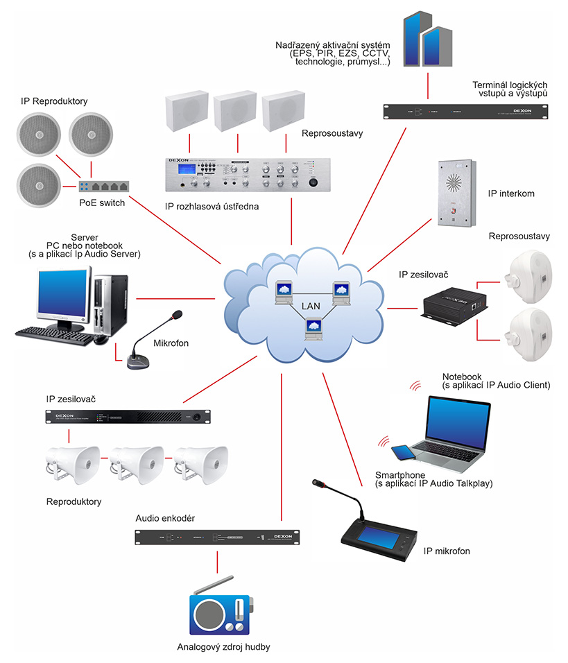 - Jenom do vaší počítačové sítě (nebo kdekoli na světě) připojíte IP zařízení (zesilovače, reproduktory, ústředny, mikrofony, interkomy, atp.) Bez námahy, bez složitého napájení a kabeláže. Pak nainstalujete software do centrálního počítače – serveru a obslužné aplikace. A je hotovo.